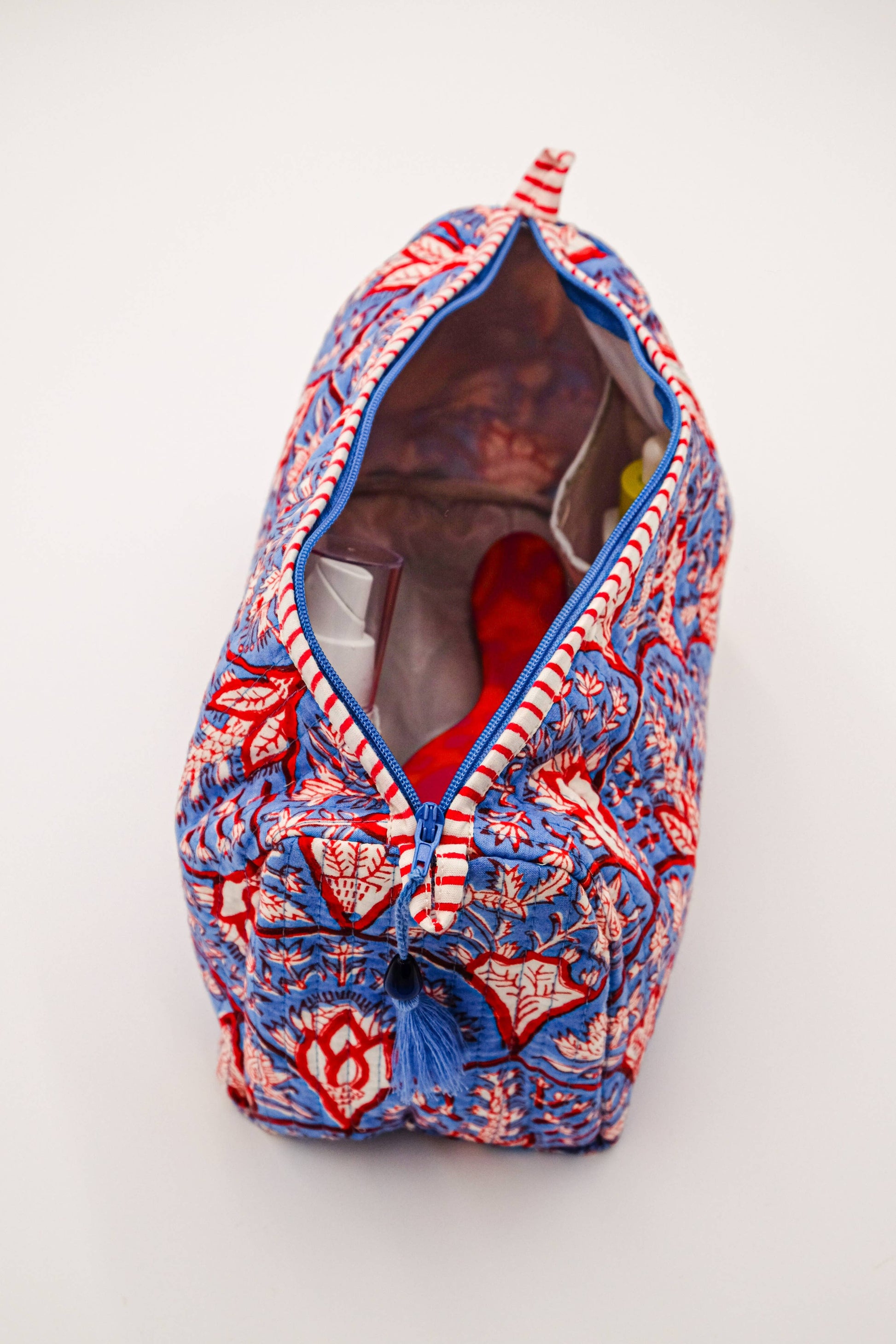 Each bag has four internal pockets to store all your trinkets. Expertly block-printed by an eighth generation family of artisans in Jaipur, the artisans are stewards of a craft that has been passed down to them generation after generation.