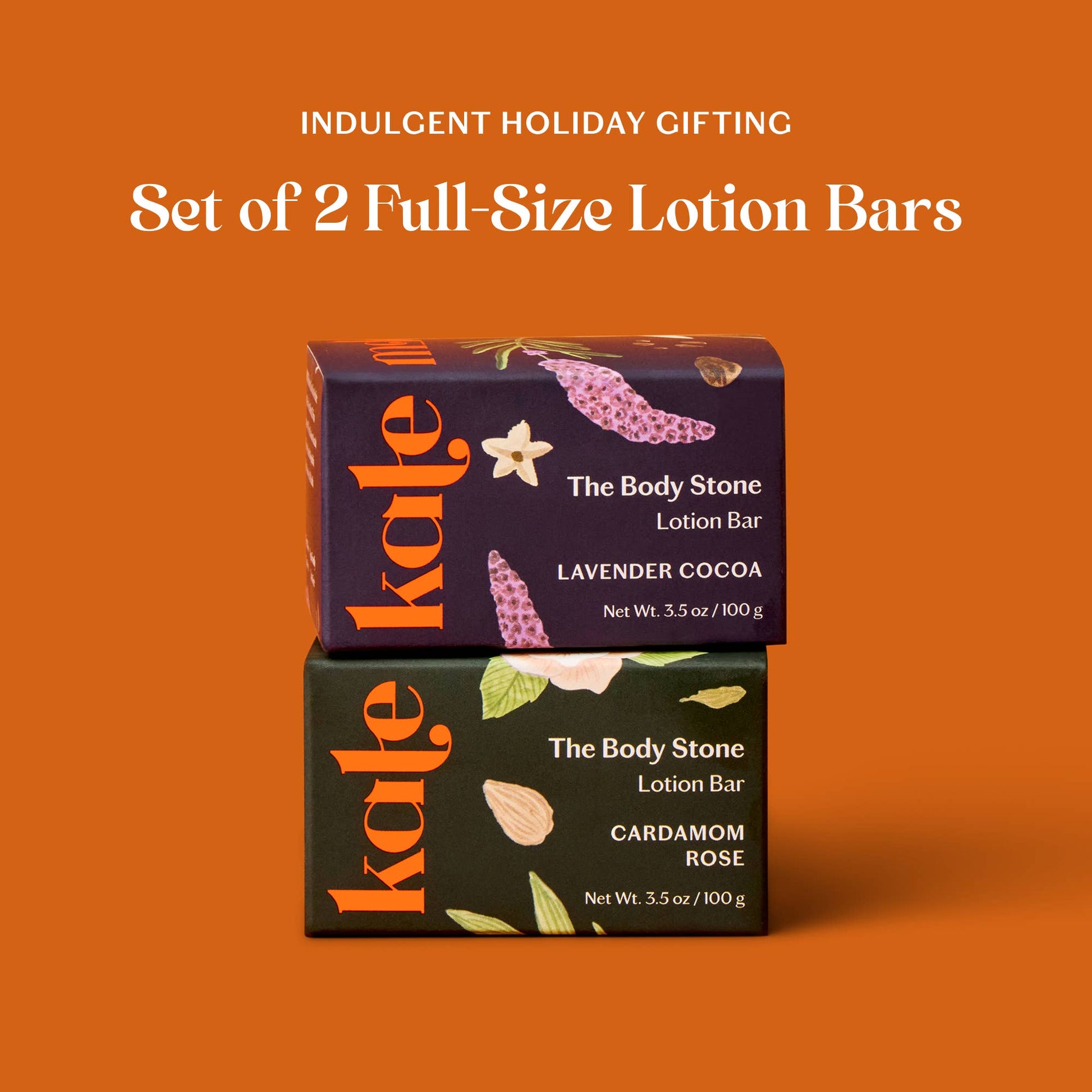 Comforting and nostalgic, this limited edition Body Stone Duo pairs velvety Lavender Cocoa with decadent Cardamom Rose. Lavender Cocoa is a floral twist on a cozy classic, inspired by winter mornings wrapped in your favorite robe. Cardamom Rose blends delicate petals with warm spice in an ode to time-honored recipes. These full-size Body Stones melt into skin to deliver deep hydration and a moment of calm amid the holiday rush.